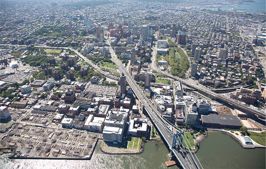Pedestrian and bicycle connections should be strengthened within the study area, particularly along the key corridors of Cadman Plaza East, Jay Street, and Flushing Avenue through transportation enhancements such as traffic calming improvements, geometric modifications, and streetscape treatments. The development of low cost, short-term remedies, as well as longer-term, capital-intensive solutions would soften these barriers. In addition, pedestrian and bicycle treatments have been focused on establishing and strengthening distinct, safe north-south and east-west connections—connections currently constrained by highway off-ramps and bridge/highway infrastructure. While Sands Street, Navy Street, and Flushing Avenue are well-established east-west corridors, connections to the north and south of this axis are lacking.