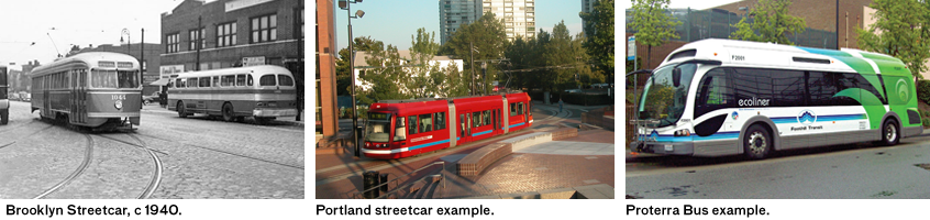 The Borough of Brooklyn once had a web of trolleys that included lines going over the Brooklyn Bridge, out to Coney Island, and connecting along the Brooklyn working waterfront from Sunset Park to Greenpoint and beyond to Long Island City. Many cities across the country have explored new surface transportation options, including New York City’s Select Bus Service (SBS) operating on various routes throughout the City.